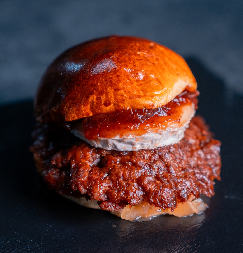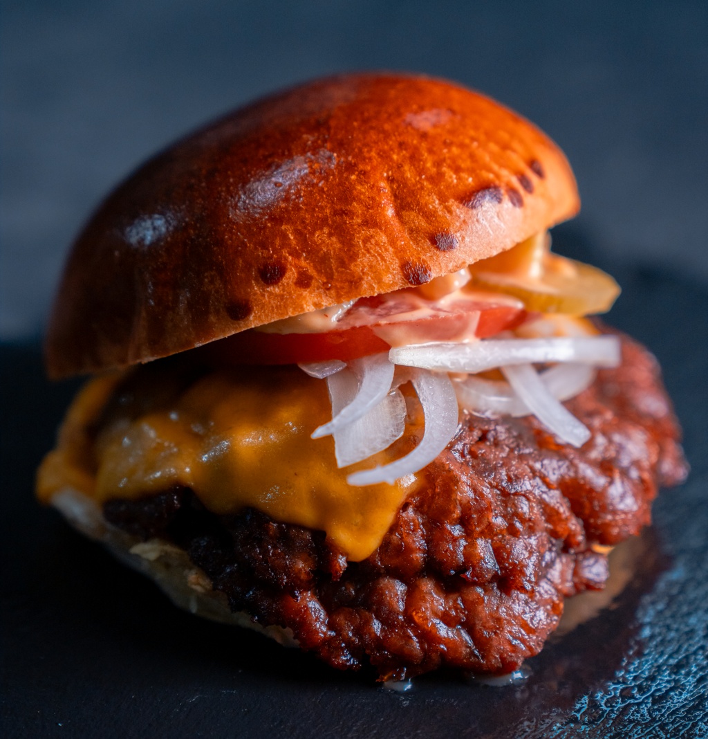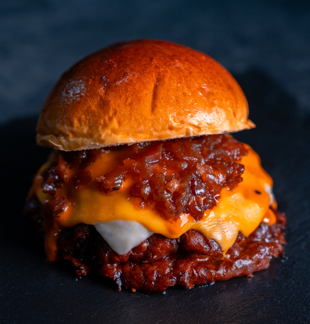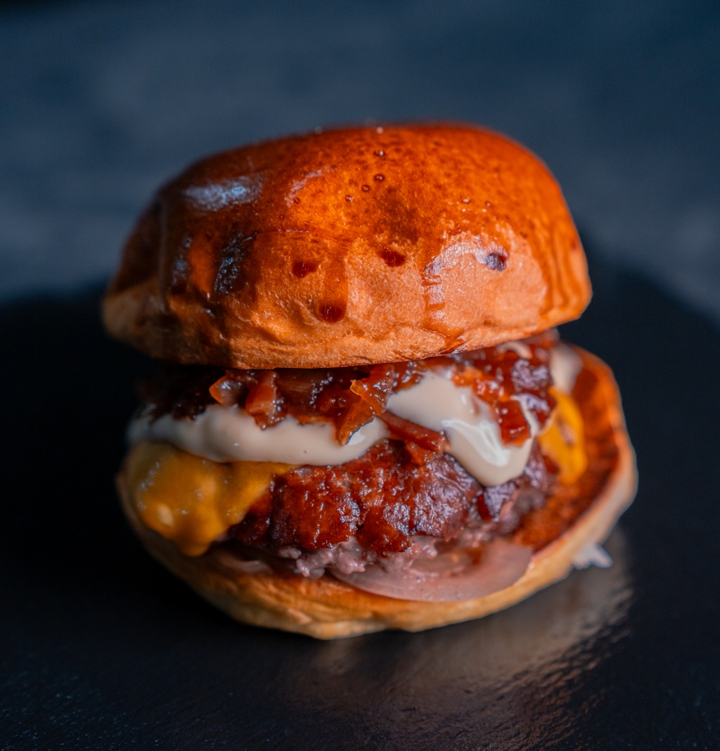 Pan de patata, doble FAT smash, queso cheddar, cebolla salteada, mermelada de bacon y salsa Cordial.