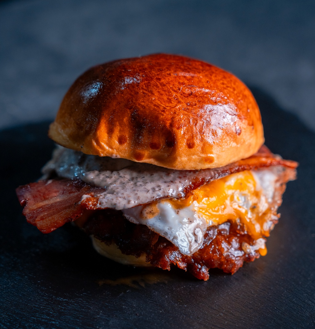 Pan de patata, doble smash, queso cheddar, huevo, bacon, lechuga y salsa trufada.