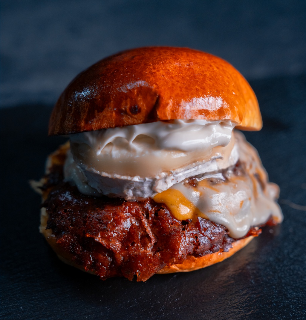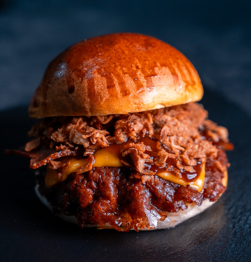 Pan de patata, doble smash, queso cheddar, bacon, pulled pork, cebolla crunchy y salsa bbq.